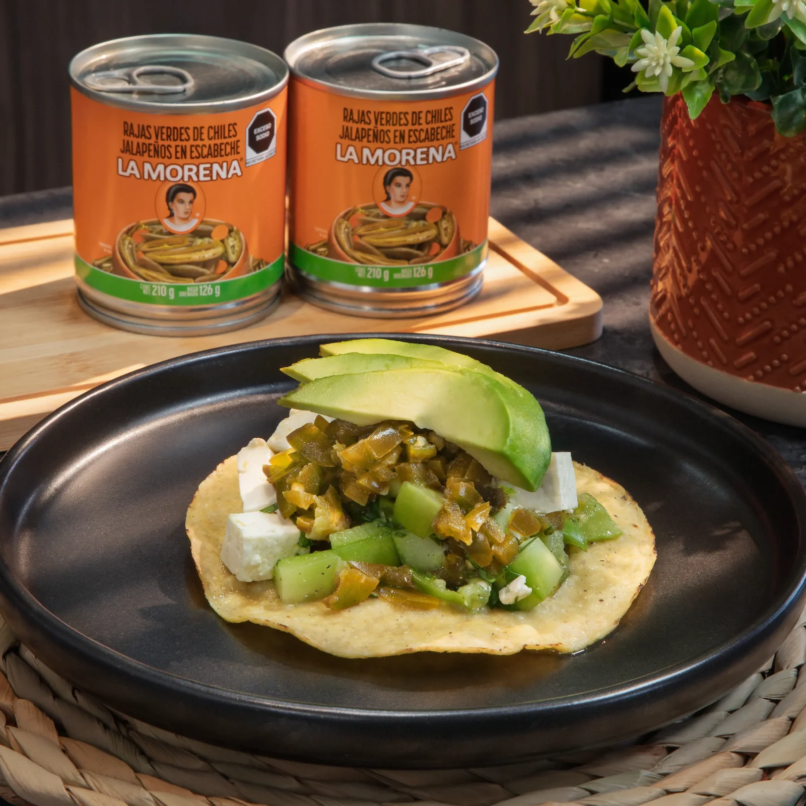 - Picar las Rajas Verdes de Chiles Jalapeños en Escabeche LA MORENA® y agregarlas al recipiente junto con un poco de su jugo.